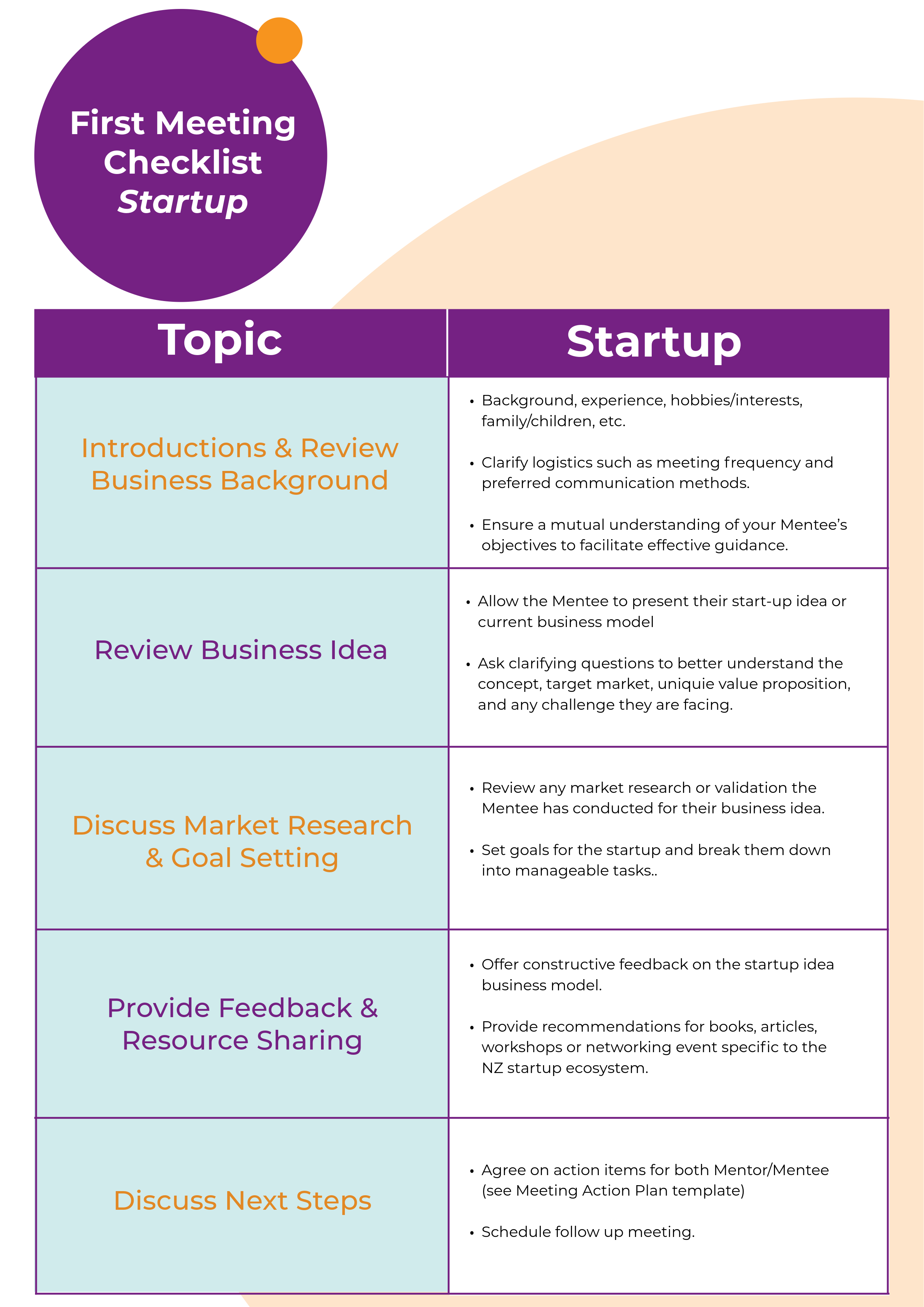 First Meeting Checklist - Startup Set expectations for your mentoring relationship with your Mentee using the First Meeting Checklist. Download Here